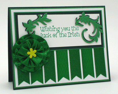 I stamped my sentiment and layered it on some green cardstock pieces, added a few short strips of ribbon from Really Reasonable Ribbon, some die-cut flourishes and a quick little gathered rose.