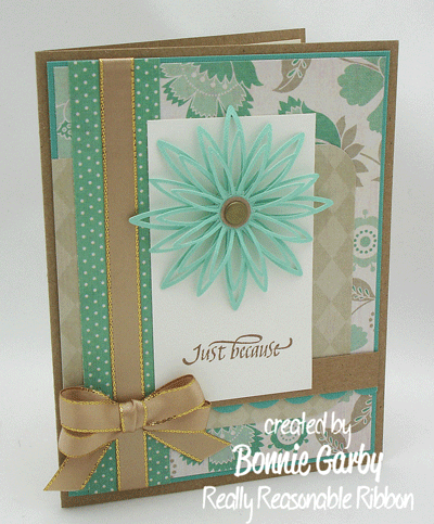 By far my favorite new toy in the last year has been by Silhouette Cameo. Many of you are probably sick of hearing about it by now, but it is just soooo much fun. I made my delicate stacked flower with my cameo. I also used my favorite new ribbon from Really Reasonable Ribbon – Satin with Gold Metallic Edges in Tan.