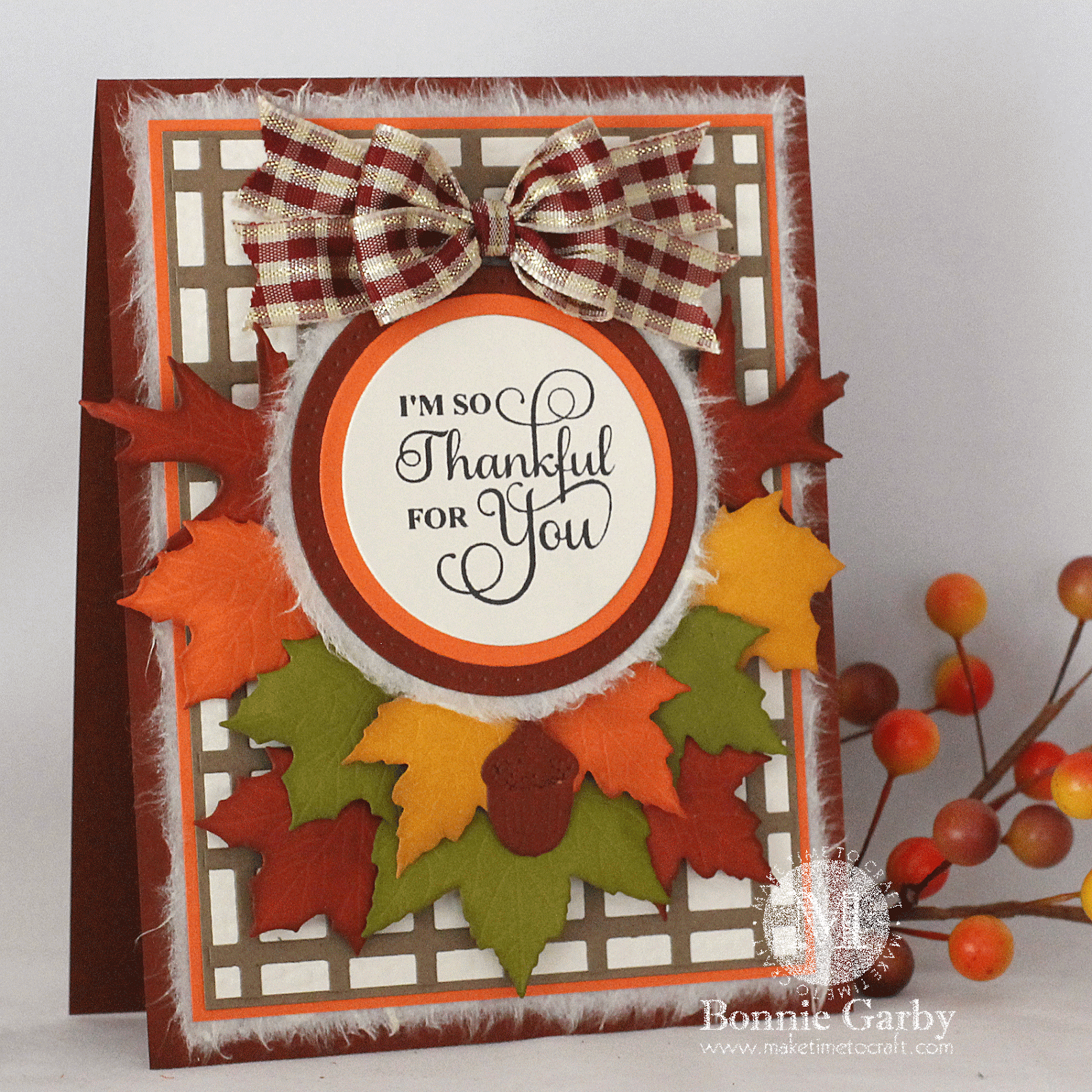 Very beautiful card. Love the Cherry Lynn small leaves and the acorn. The ribbon for this bow is a perfect match.