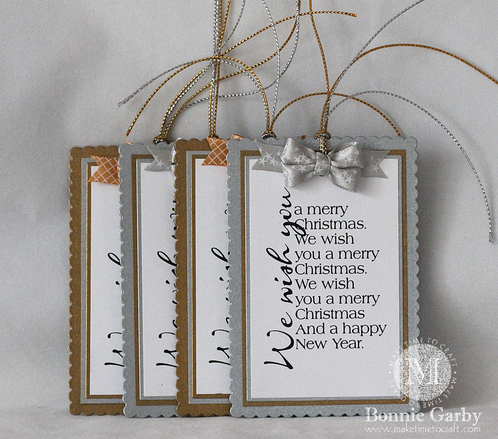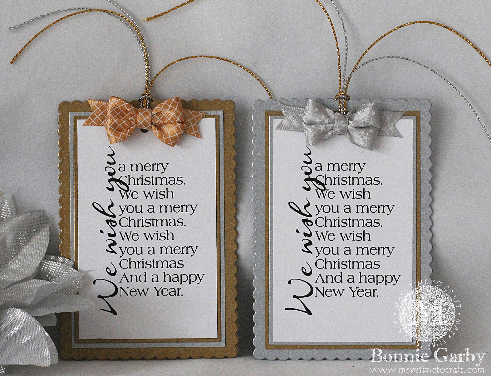 I’m on a bit of a tag kick, so I made another simple set.  I trimmed them all with pretty double-loop bows using two of the 3/8″ satin styles from the RRR November Ribbon Club Assortment.  The bows were made on my Bow-it-All V2.0.  The tag ties are made of Silver and Gold Metallic String from Really Reasonable Ribbon.