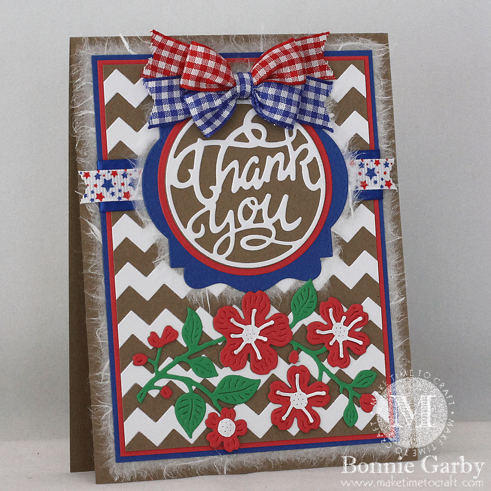 I love the look of kraft colored cardstock mixed with the red, white and blue. It makes me happy! The beautiful dies used on my card are from Cheery Lynn Designs. Beautiful ribbon and great dies are a winning combination!