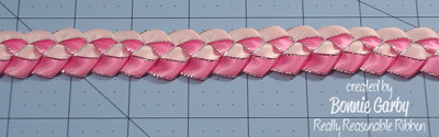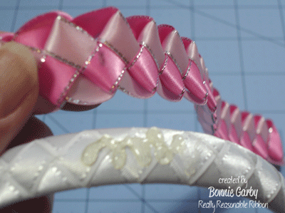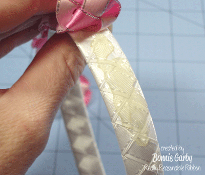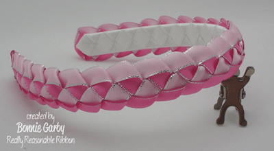 Next I made the military braid with 3/8″ Satin with Silver Metallic Edge in Pearl Pink, and Hot Pink. This beautiful ribbon is available in 20 fun colors and works well for so many projects. You’ll use about 60″ of each color, but to be safe, be sure you start with at least 2-yards of each. For this project there is no need to cut off a certain length of ribbon. Just work from whatever length you have. That way there will be minimal waste. Follow the direction in the video below and stop when you have the length you need to cover your headband from tip to tip. There is a little give in the braid, so you can stop when you are a smidge short and stretch it to fit.