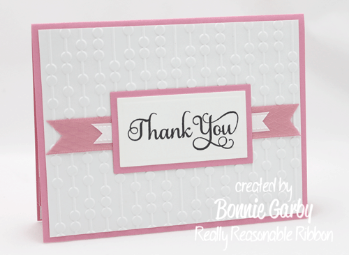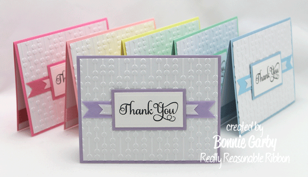 I layered my sentiment over some gorgeous ribbon from Really Reasonable Ribbon.  I layered a piece of 3/8″ White Satin w/Grosgrain Edge on top of a pastel colored piece of 5/8″ Diamond Satin to match the color of each card and ran it right down the middle.  Then I added the layered sentiment on top of the ribbon.  A very simple ribbon treatment for a quick CAS card.