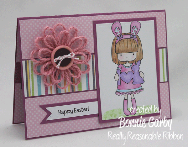 I made a little time for myself and colored up this cute Easter Image from Whimsie Doodles. Isn’t she adorable? I also used one of my jute loopy flowers from yesterday. Love those things!!