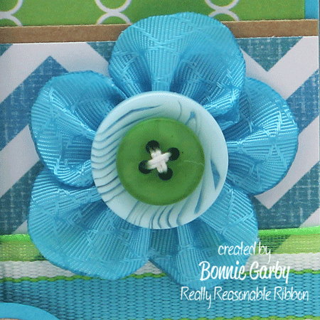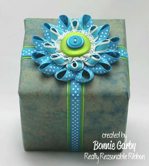 I then set out to make a cute flower to add to a hair clip or Pony-O Ring using some ribbons from the assortment and the directions I posted HERE. I felt it turned out too big though, so it turned in to a gift topper. I think it’s really pretty this way. I used four of the ribbons from the April Ribbon Club Assortment along with Buttons from Really Reasonable Ribbon.