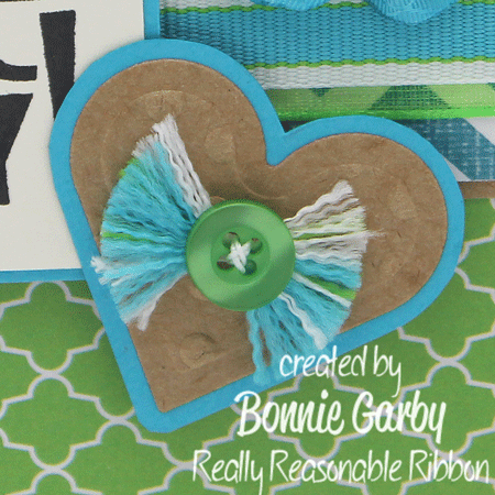 For the heart I added a little embellishment made from the Island Splash Striped Grosgrain included in this month’s Ribbon club assortment. This idea came from an unfortunate (or perhaps fortunate?) vaccuuming incident. A ribbon end from one of the spools was sticking out and got caught in the vaccuum and naturally fayed off a huge length in a nano-second, but hey, thats how good ideas are born, right? I thought the frayed threads might make an interesting embellishment. I just cut about a 1-1/2″ piece of ribbon, wrapped some strong thread around the center and pulled out the weft thread leaving the slightly wavy long warp threads. Cool look, right?