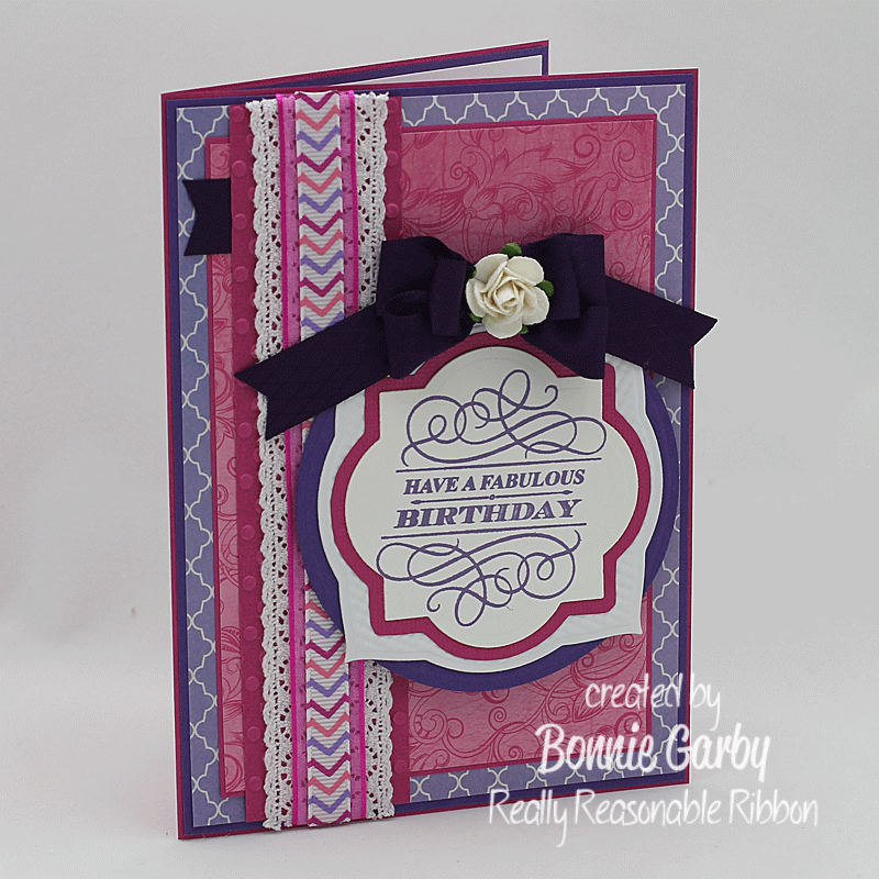 I layered several of the ribbons from this months assortment and ran them lengthwise down the left side of the card. The crochet lace is two pieces side by side to create the desired width. The bow is a layered bow made with my Bow-it-All Tool using the Plum Diamond Satin from the Ribbon Club assortment.