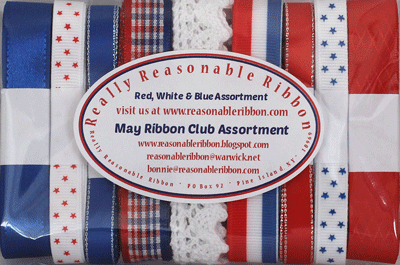 This month the Really Reasonable Ribbon Monthly Ribbon Club Assortment is a fun Patriotic themed mix. I just love mixing red, white and blue together in a project! If you are not a member, you are missing out!! JOIN TODAY and begin your subscription with this gorgeous assortment.