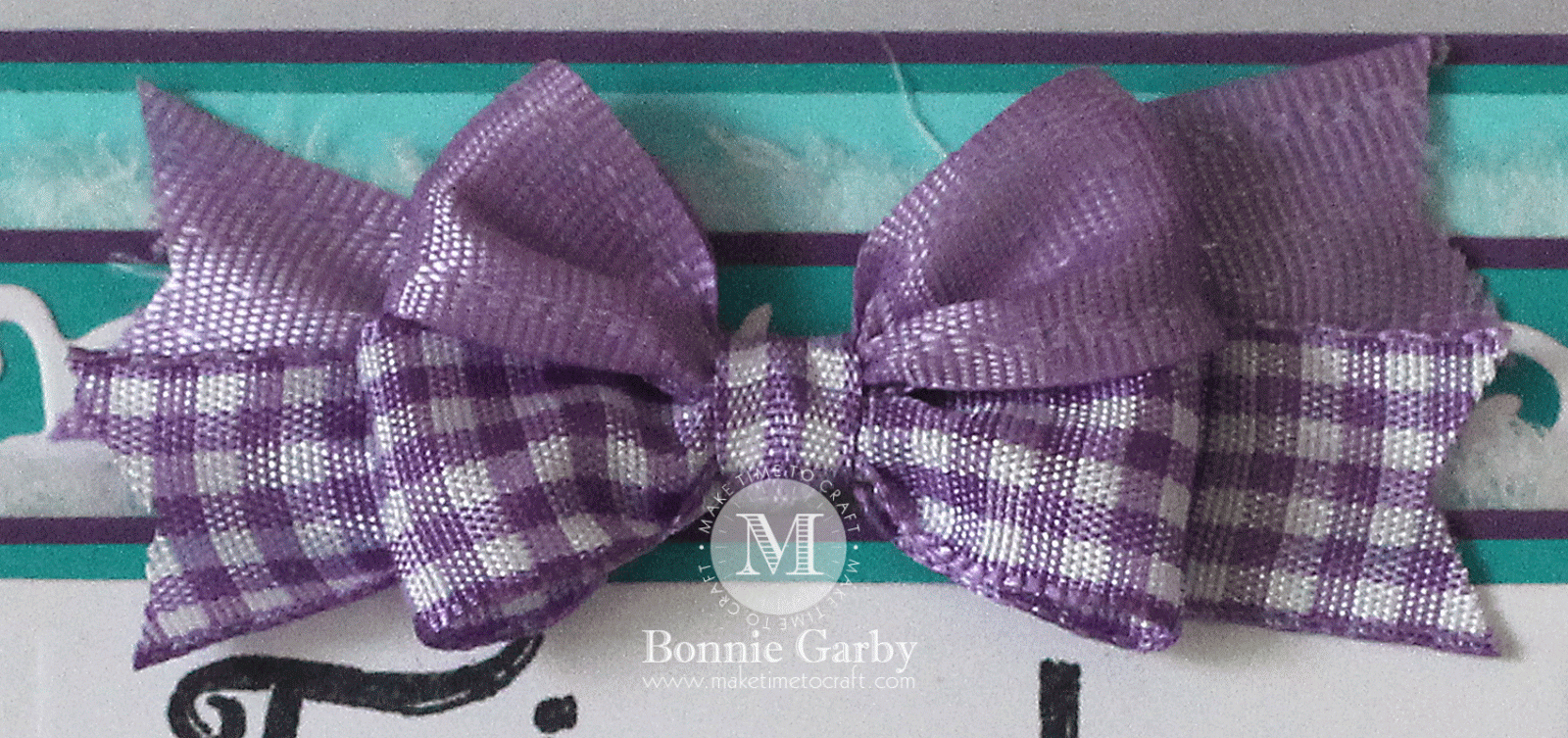I soooo wanted to use this purple bow with the gingham on this card, but I just couldn’t make it work.  I thought it might with the thin purple borders on the card, but nooooo.  So, I have a purple bow in the bank for another project.