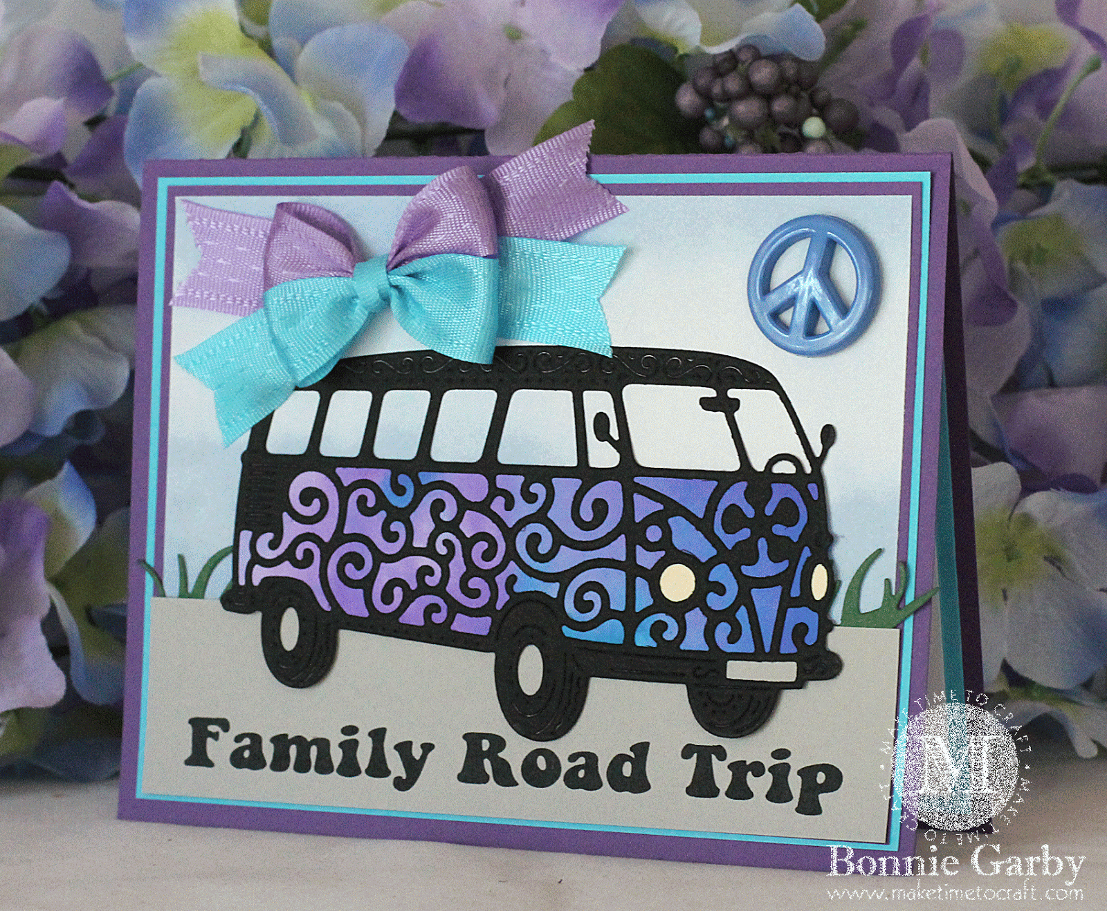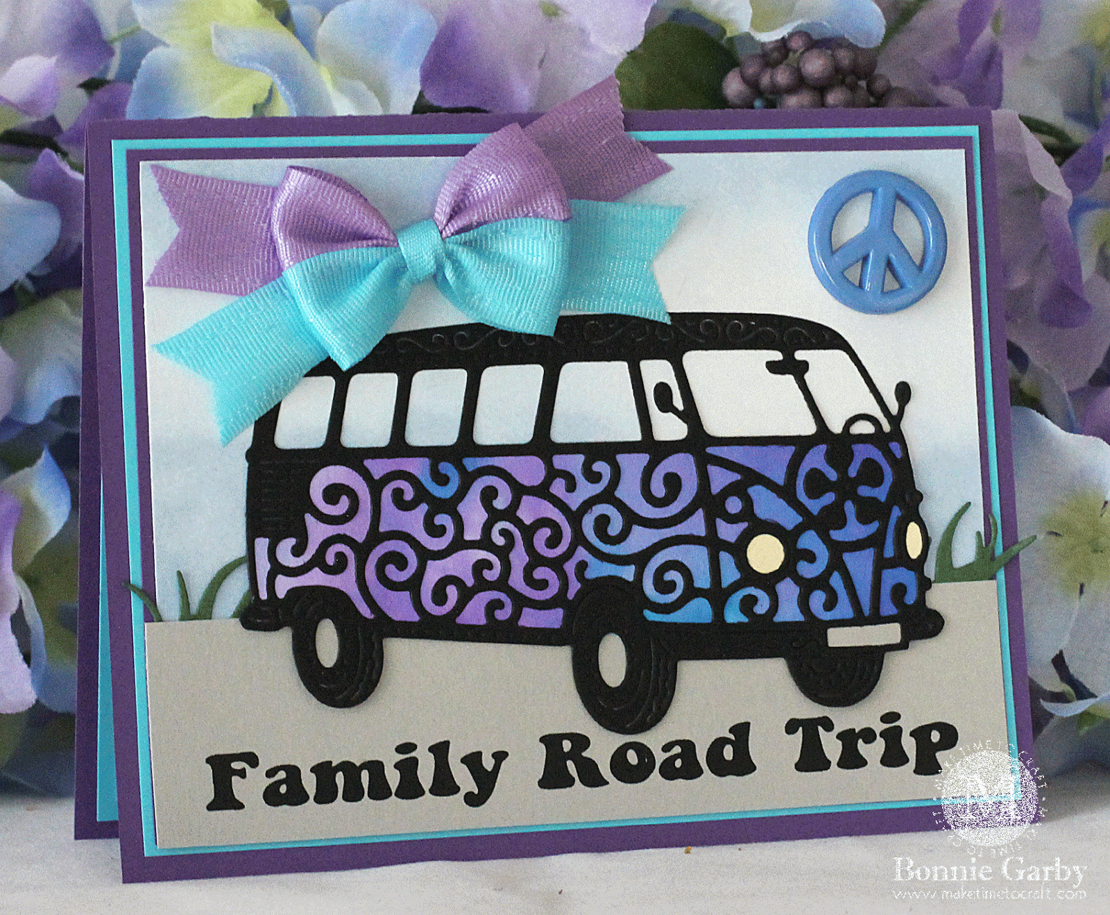 One of the new dies in the October release from Cheery Lynn Designs is this fun retro VW bus. I had a great piece of purple and blue tie-dye looking paper I created a while back with Color Burst pigment powders from Ken Oliver and I knew it was perfect for this project. I applied a piece of Stick It Adhesive to the back of a piece of black cardstock and then cut out the Groovy Bus. Then I fussy cut the dyed paper so it would fit behind the lower part of the die cut. I added small pieces of yellow for the headlights and grey for the hubcaps and license plate and then added the tie-dye paper. I love the way it came out. I created a road with grey cardstock and put a few blades of grass on either side of the van.