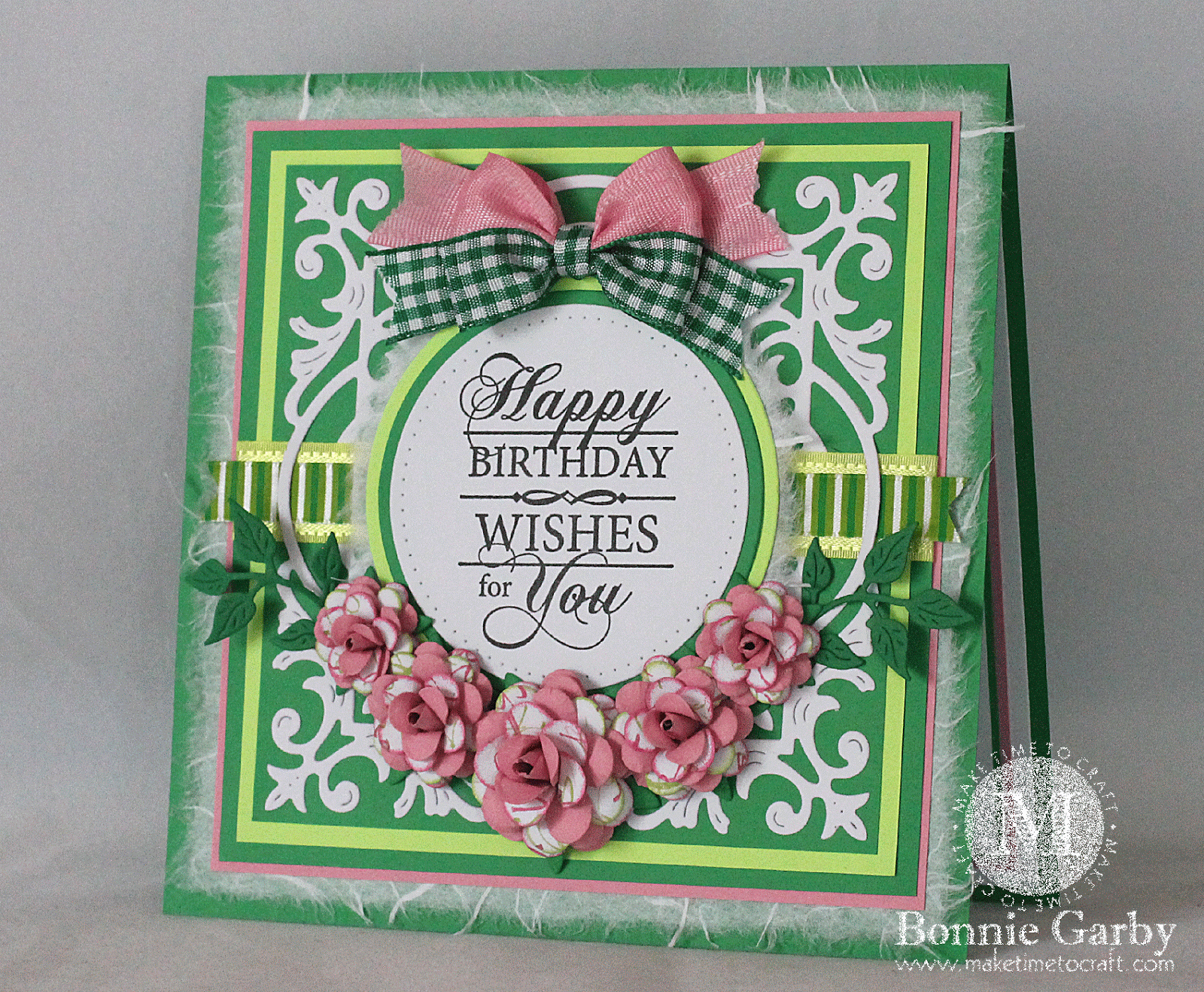 My beaufiful bi-color double-loop bow is the real show stopper. It’s made using 5/8″ Sherbet Deliciate Stitched Satin Ribbon and 5/8″ Emerald Plaid Ribbon from the February Ribbon Club Assortment. The bow was created on my Bow-it-All V2.0. I also ran a strip of the 5/8″ Pistachio Satin with Grosgrain Edge Ribbon topped with 3/8″ Mixed Green Vertical Stripe Ribbon across the middle of the card under the sentiment for more texture. Both of those styles are from the February assortment as well. I love the mix of darker green and lighter almost yellow green colors. Add in a zing of pink and it’s really quite eye catching.