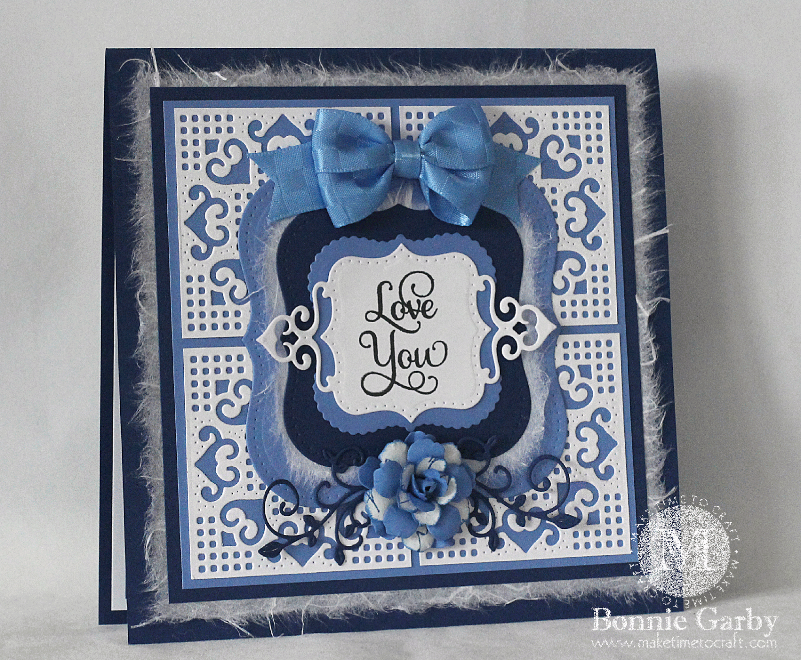 This card showcases the gorgeous new Lords & Commons Square Doily.  I used the small inner square in this set and cut it four times and then adhered them to the square medium blue base for a different look.  I also handmade that gorgeous blue tea rose.  If you make your own flowers, they always match your project perfectly!
