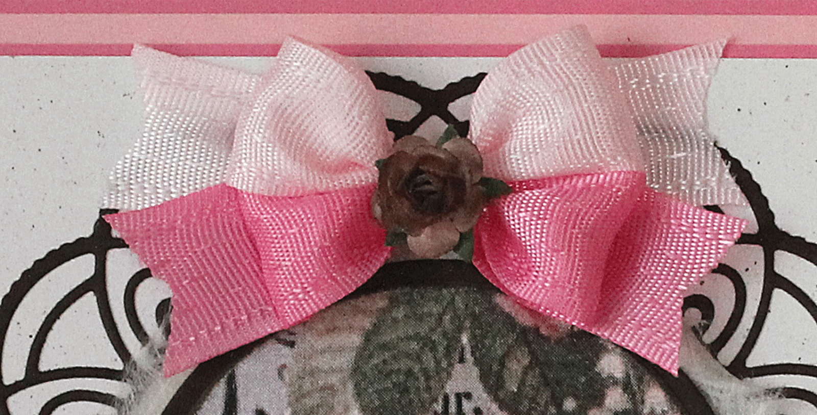 My bi-color double-loop bow was made using Pearl Pink and Hot Pink 5/8″ Delicate Stitched Satin Ribbon from Really Reasonable Ribbon. The bow was created on my Bow-it-All tool. I finished it off with a 10mm Open Rose in the center.