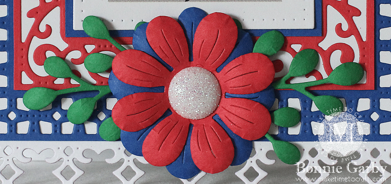 My fun flower was made with the larger flower die in the Floral Bouquet kit and one of the foliage dies. If you are new to paper flower making, this set is fabulous. I cut this flower in blue and red and shaped the petals just a little with a foam pad and large stylus. So easy. The center is finished off with a sparkly gem. Then I just shaped the foliage leaves the same way and attached them to the back of the flower and then to the card under the sentiment.