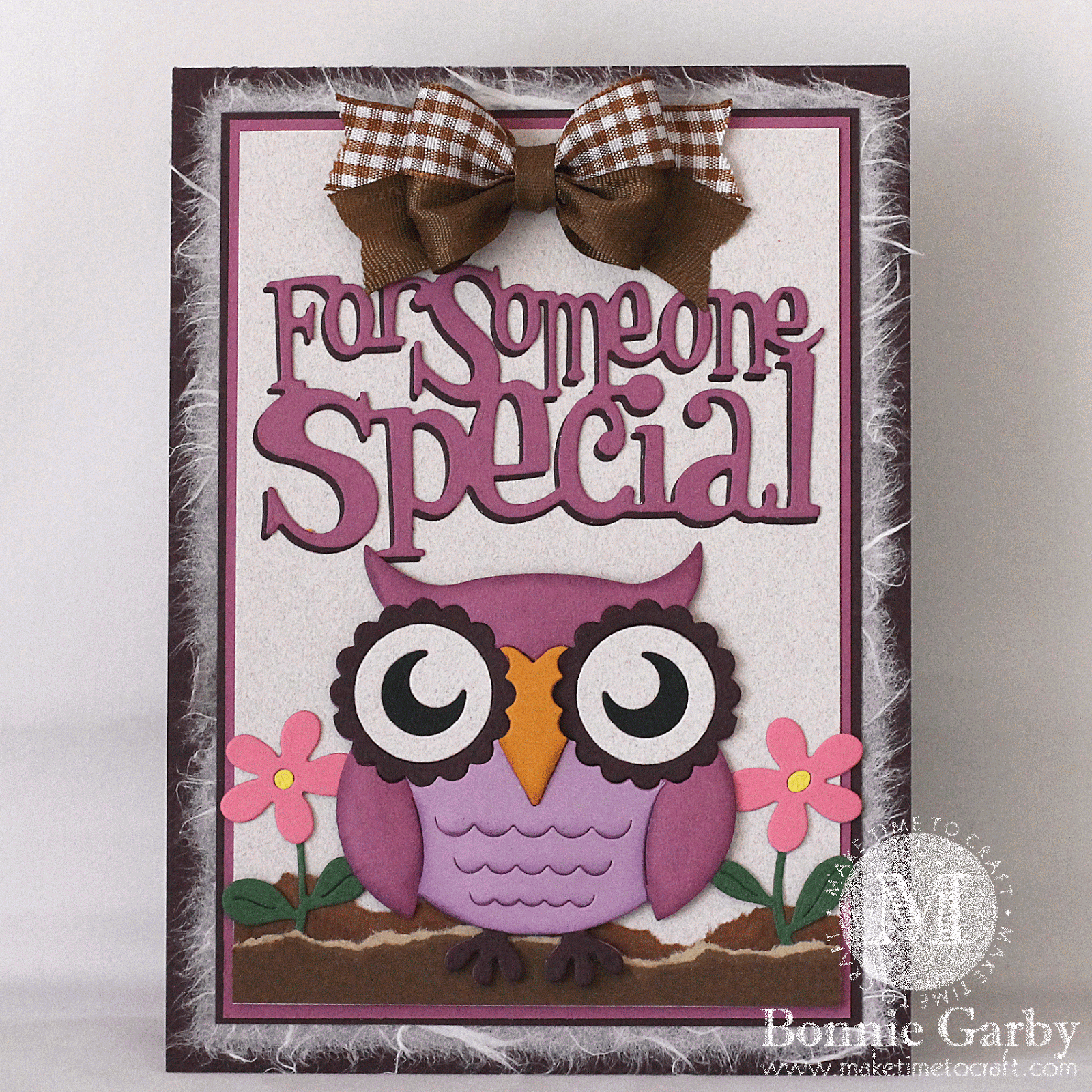 I die cut the adorable Whimsical Owl from Cheery Lynn Designs in several different colors. I used the lavender as the base and then cut and added the different sections in the colors of my choice. I also lightly inked the edges of the pieces for a little depth. The sentiment was layers and slightly offset on dark brown card stock to create a shadow effect.