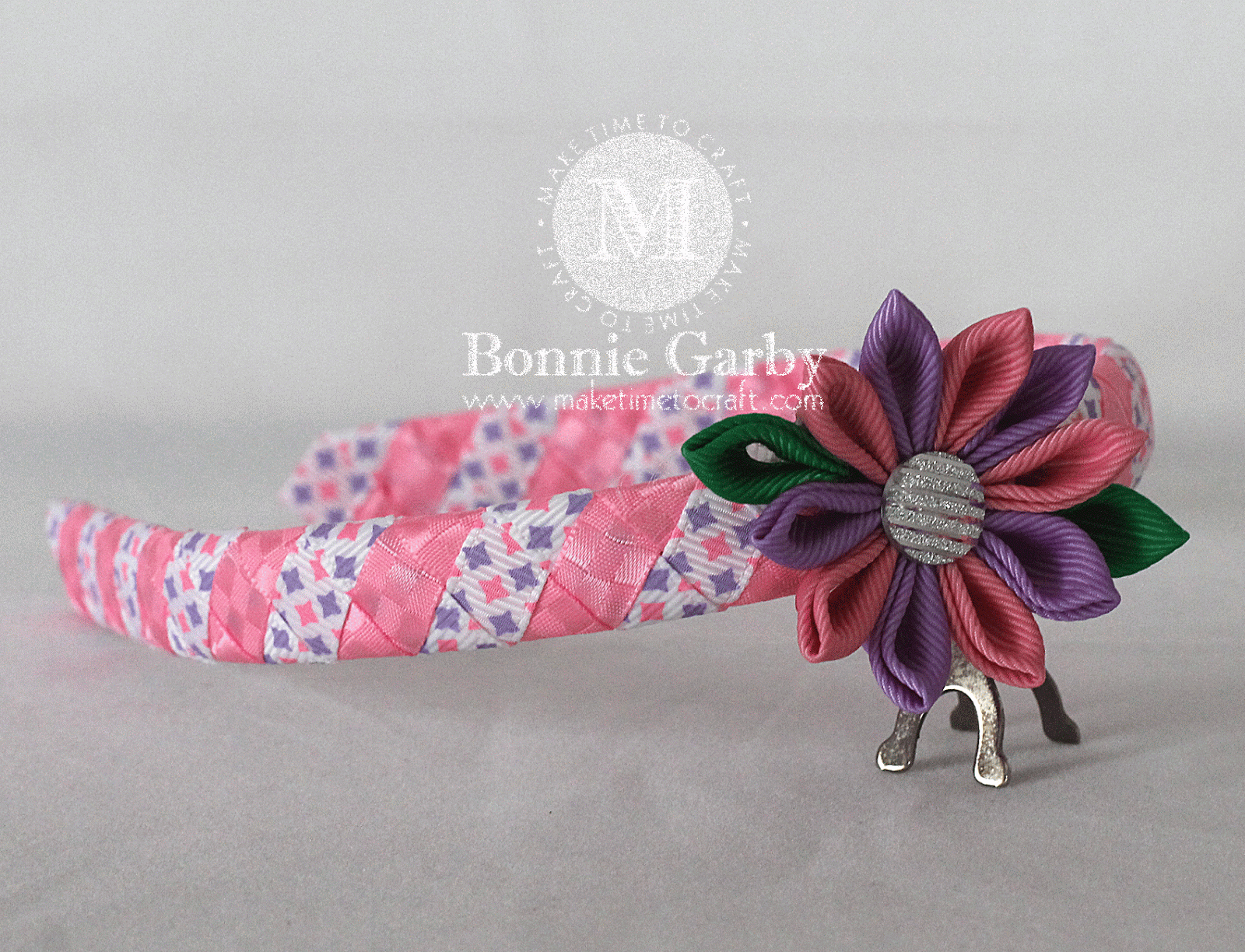 This headband was created on a 1/2″ Plastic Headband base using two of the ribbon styles from the July Ribbon Club assortment.