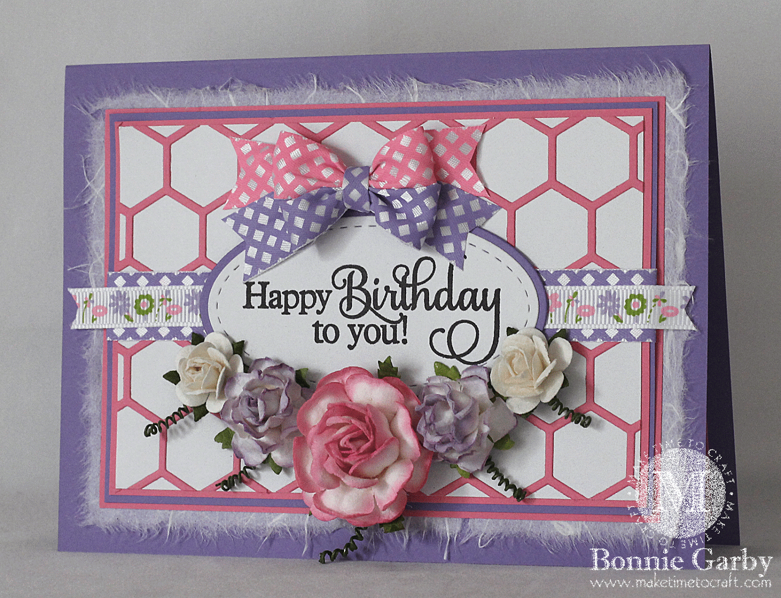 I ran a strip of the Hyacinth Lattice Print Satin ribbon across the center of the card and I topped it with a strip of Wildflower Print Grosgrain Ribbon. Then I added several sizes of Mulberry Roses from Wild Orchid Crafts around the bottom of the sentiment. I love having a good selection of these flowers on hand to quickly add to any project. Really Reasonable Ribbon has a HUGE offering of different styles of Mulberry Flowers.